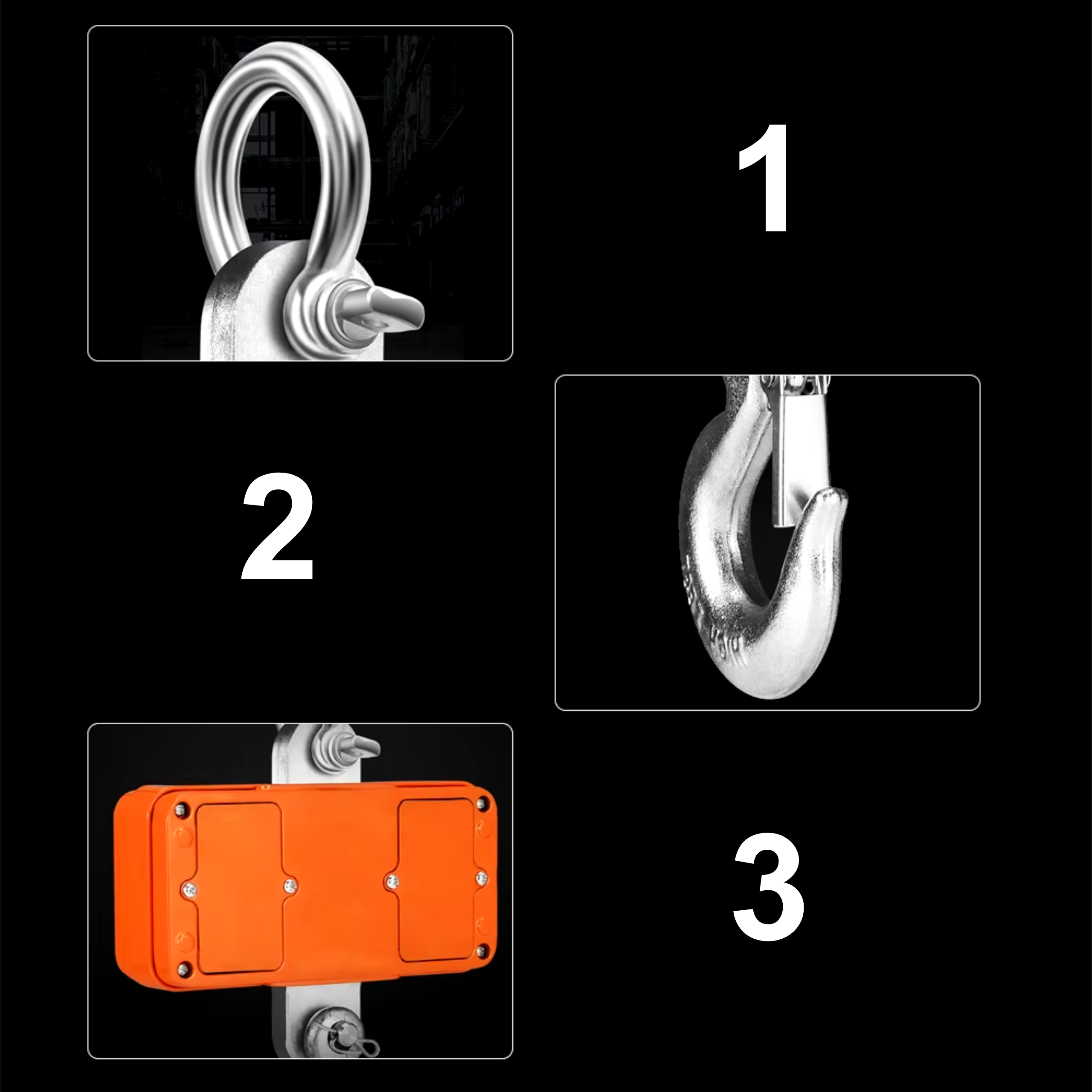 2️⃣ Hak – Solidny stalowy hak, zdolny do utrzymania ciężaru do 1500 kg. Zapewnia bezpieczeństwo i stabilność podczas ważenia dużych ładunków.