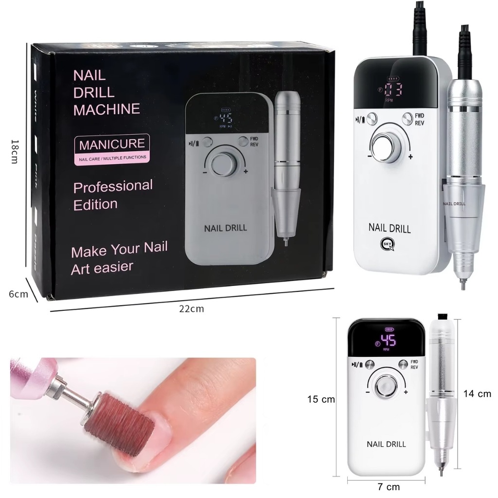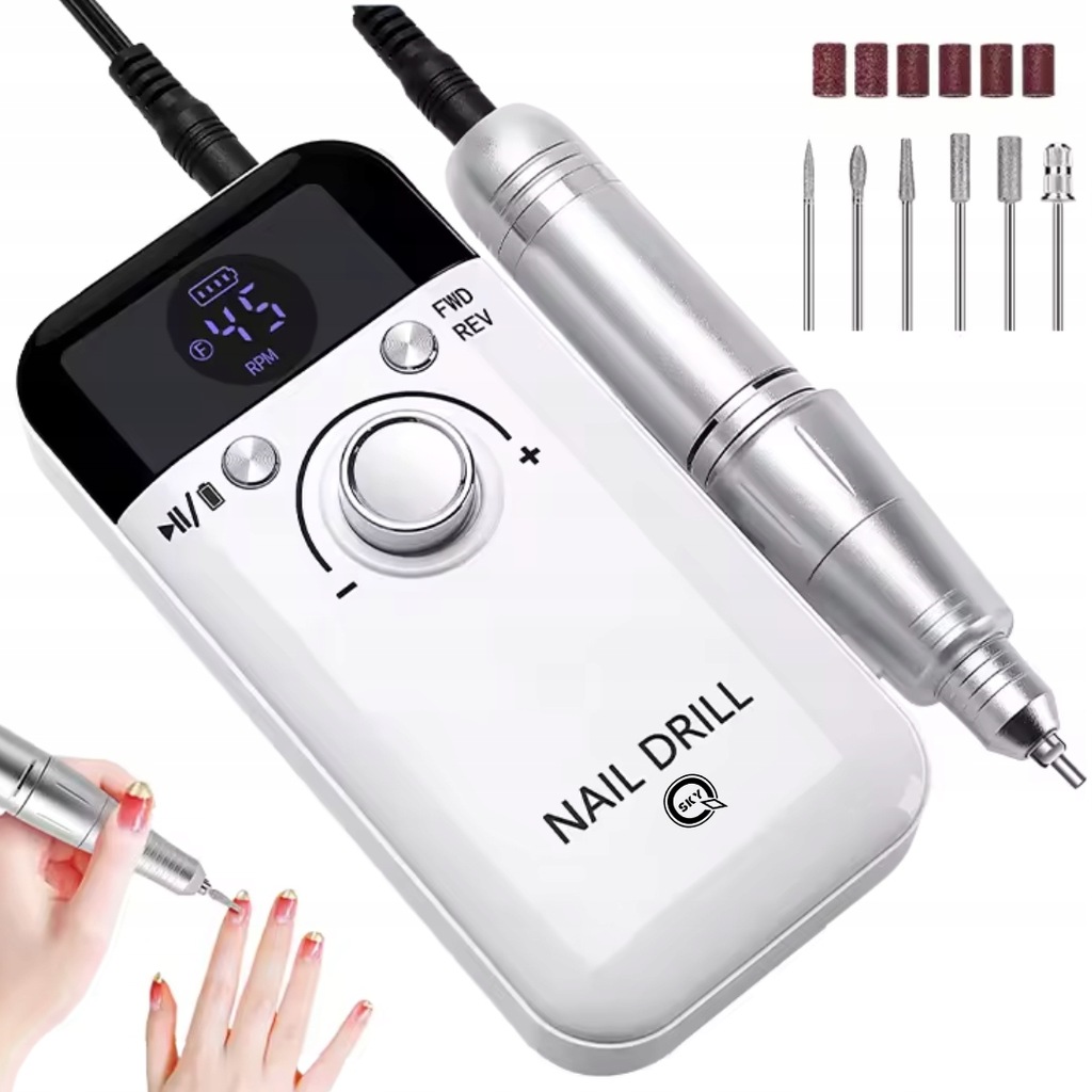 Profesjonalna frezarka do paznokci V6 z silnikiem bezszczotkowym, regulacją prędkości do 45 000 obr./min, inteligentnym ekranem LCD i wydajną baterią zapewnia niskie ciepło, cichą pracę i pełną kontrolę podczas manicure oraz pedicure. Idealna do żelu, akrylu, proszku, skórek i precyzyjnego opracowania paznokci.