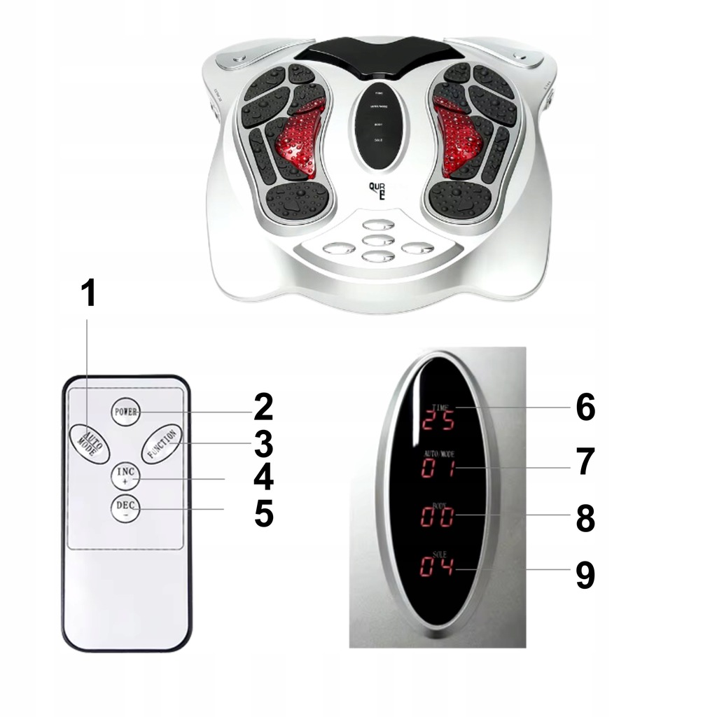 ✅ Terapia TENS (elektrostymulacja) – urządzenie wykorzystuje impulsy elektryczne o regulowanej intensywności (0–99 poziomów), które stymulują punkty na stopach, wspomagając redukcję bólu i poprawiając regenerację mięśni.