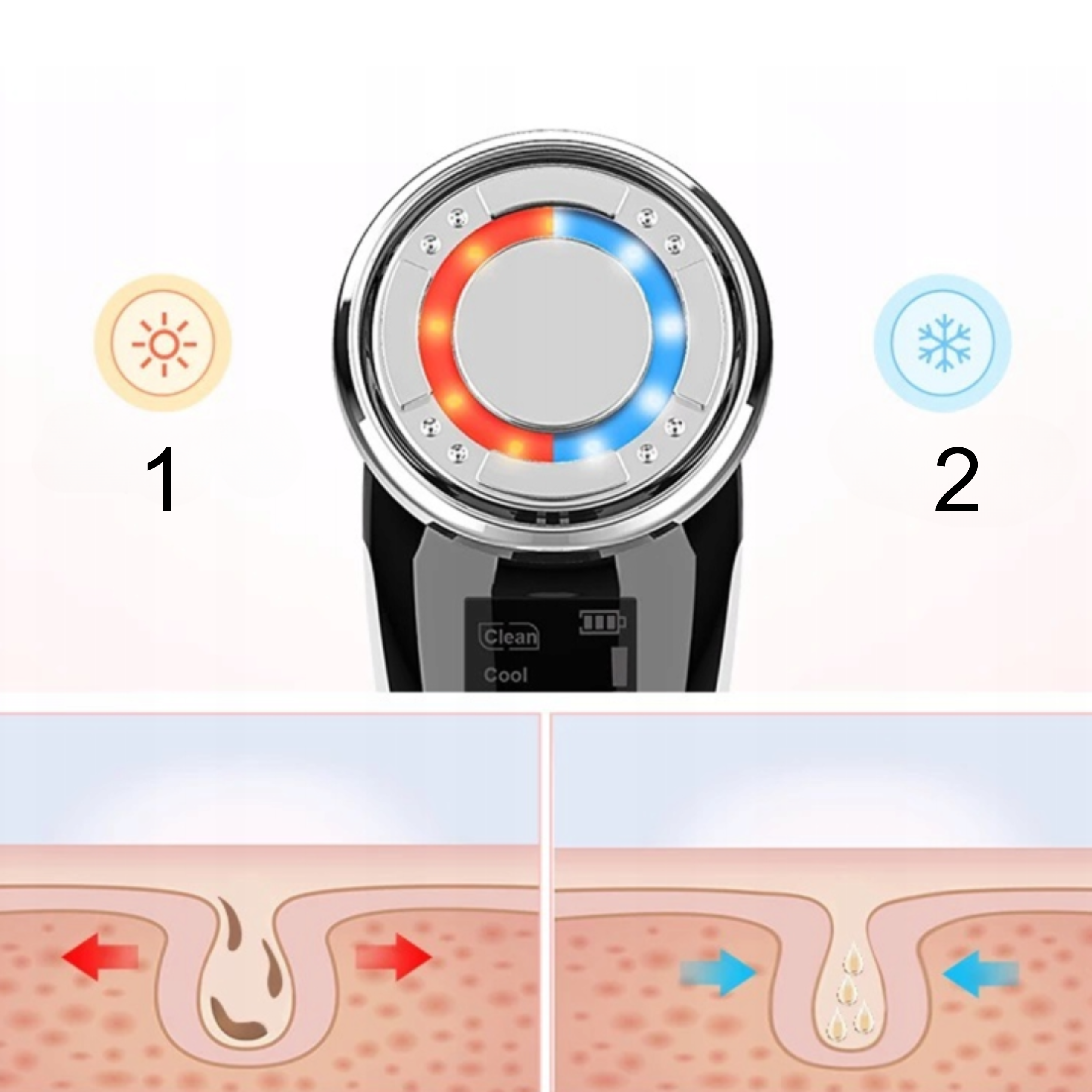 1️⃣ Ultradźwięki: Wysokiej częstotliwości ultradźwięki precyzyjnie docierają do głębokich warstw skóry, skutecznie oczyszczając pory z zanieczyszczeń.