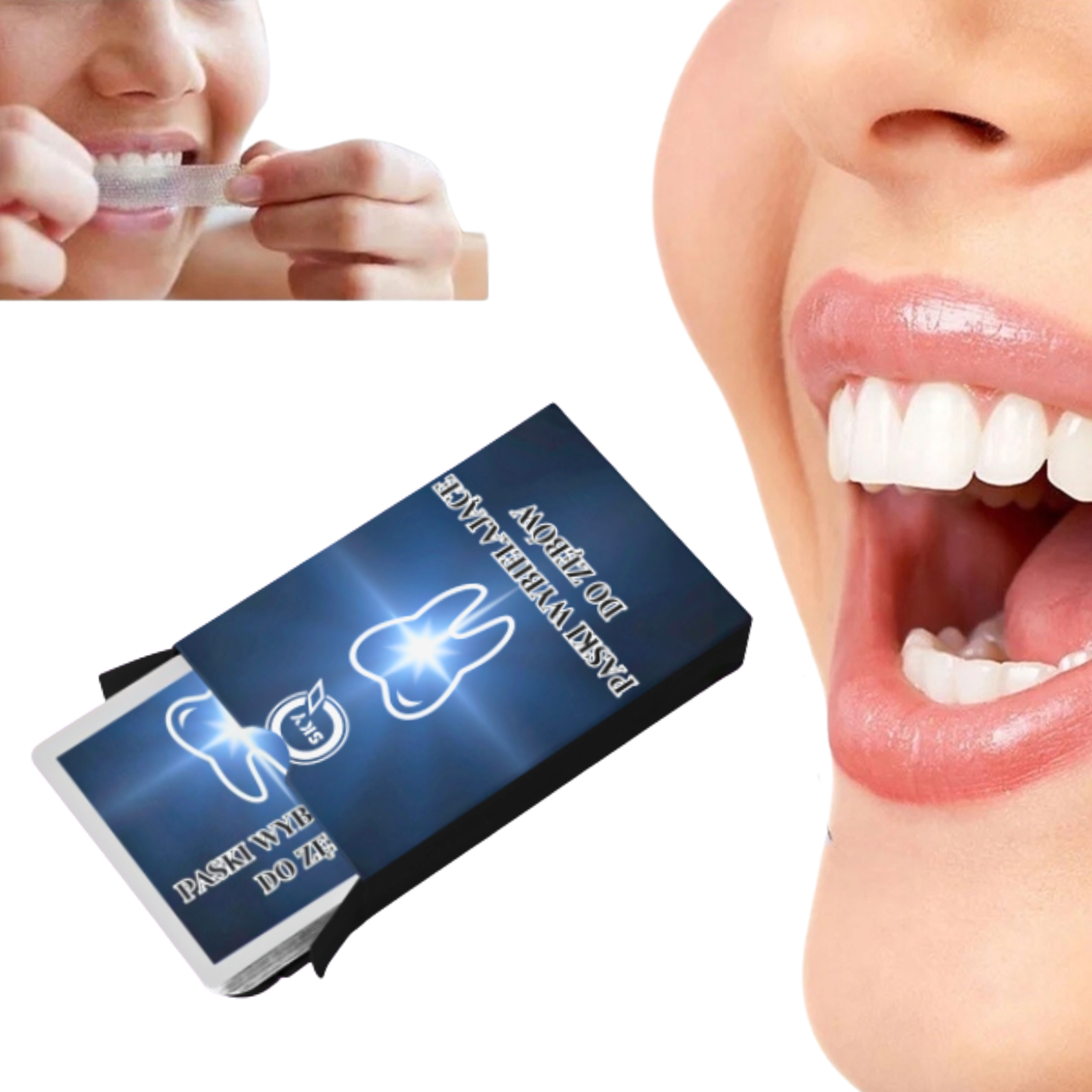 2️⃣ Pasek połóż na zębach – kiedy poczujesz, że pasek leży równomiernie na zębach przyklej go dociskając palcami