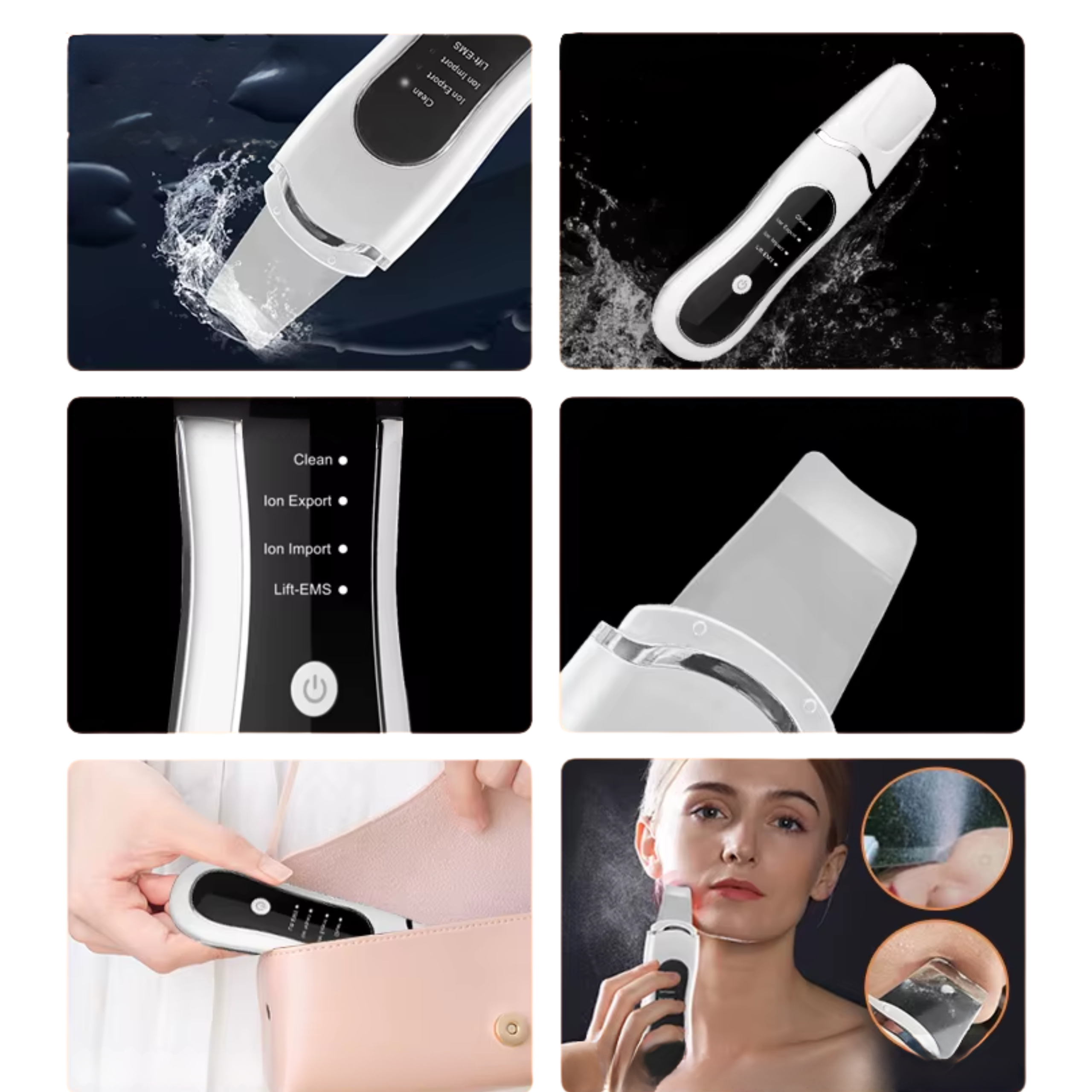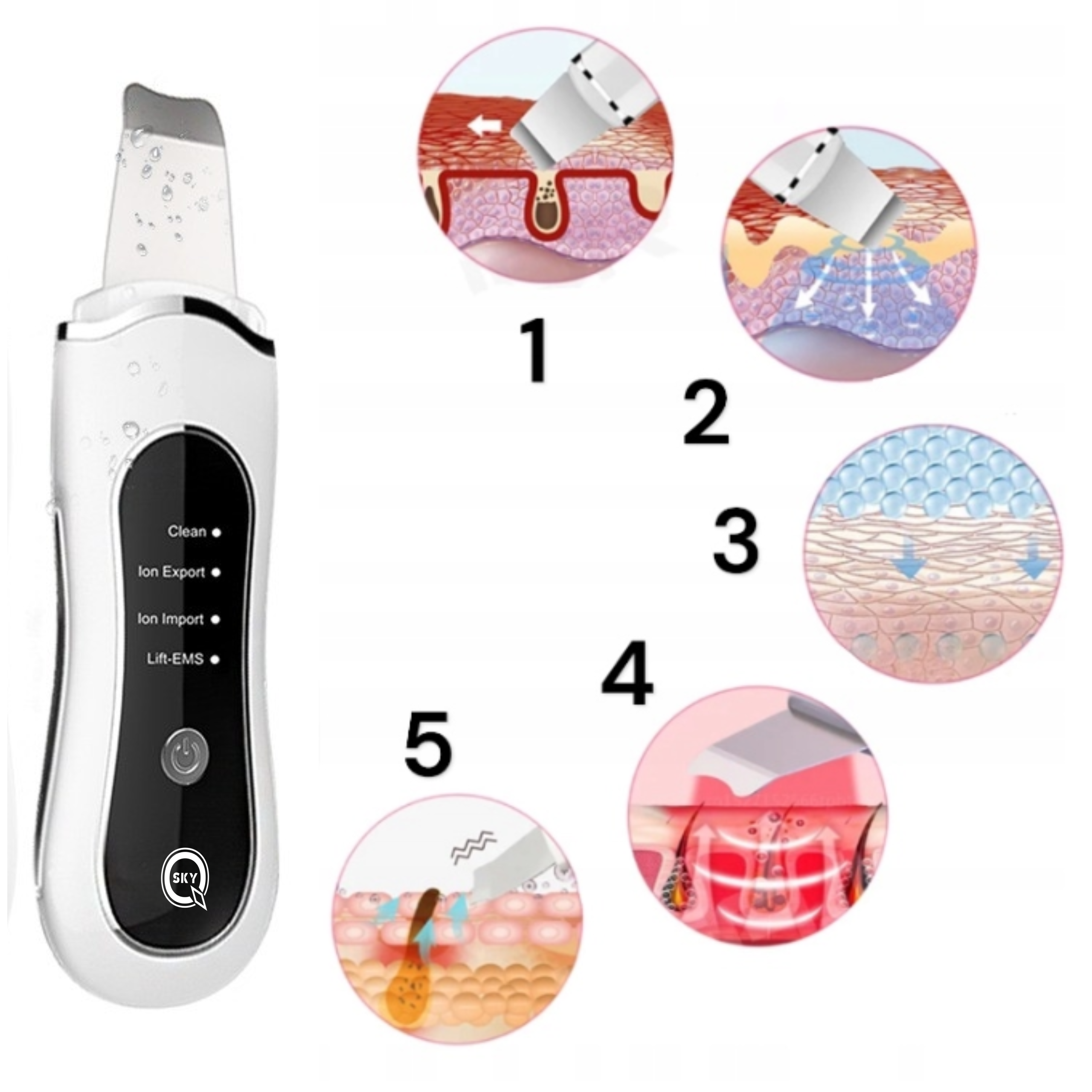 Po nawilżeniu skóry wodą, wibracje ultradźwiękowe o wysokiej częstotliwości rozpylają wodę, całkowicie zmiękczając martwy naskórek. Jony dodatnie pomagają eksportować zanieczyszczenia znajdujące się w porach skóry. Pomaga złuszczać martwe komórki naskórka.