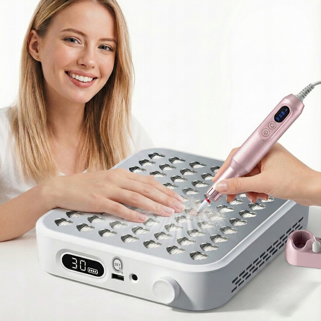Nowoczesny, bezprzewodowy pochłaniacz pyłu do paznokci, stworzony z myślą o wygodnej i higienicznej pracy. Silnik bezszczotkowy, moc 56W oraz wbudowany akumulator zapewniają skuteczne odsysanie pyłu bez kabli i ograniczeń.
