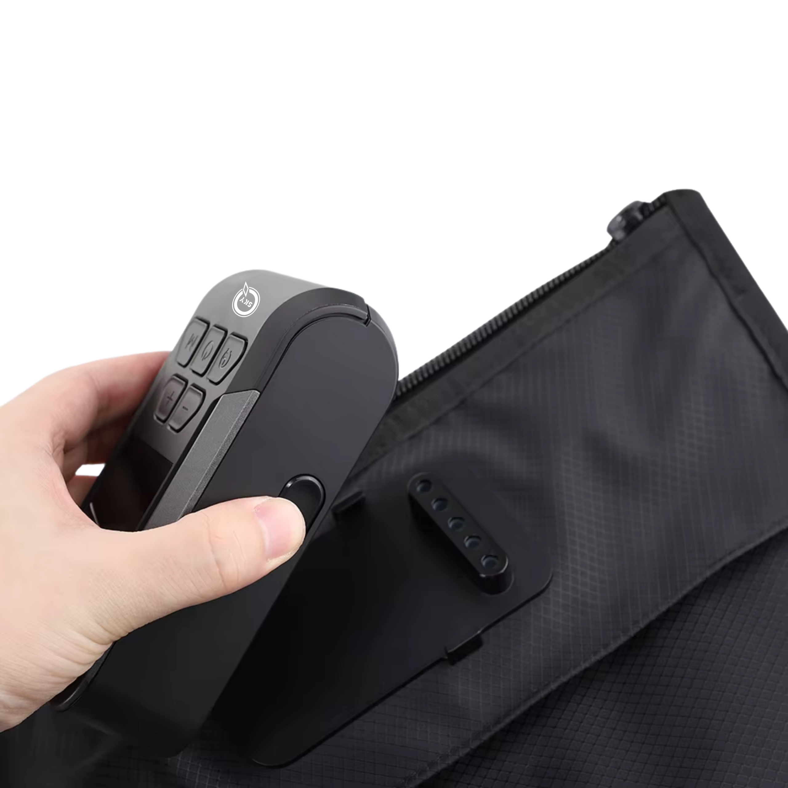 1️⃣ Kompaktowa jednostka sterująca – bezprzewodowa, bez kabli, montowana bezpośrednio na mankiecie. Nie wymaga trzymania w ręce ani dodatkowego zasilacza, dzięki czemu urządzenie jest mobilne, wygodne i idealne do użytkowania w dowolnym miejscu.