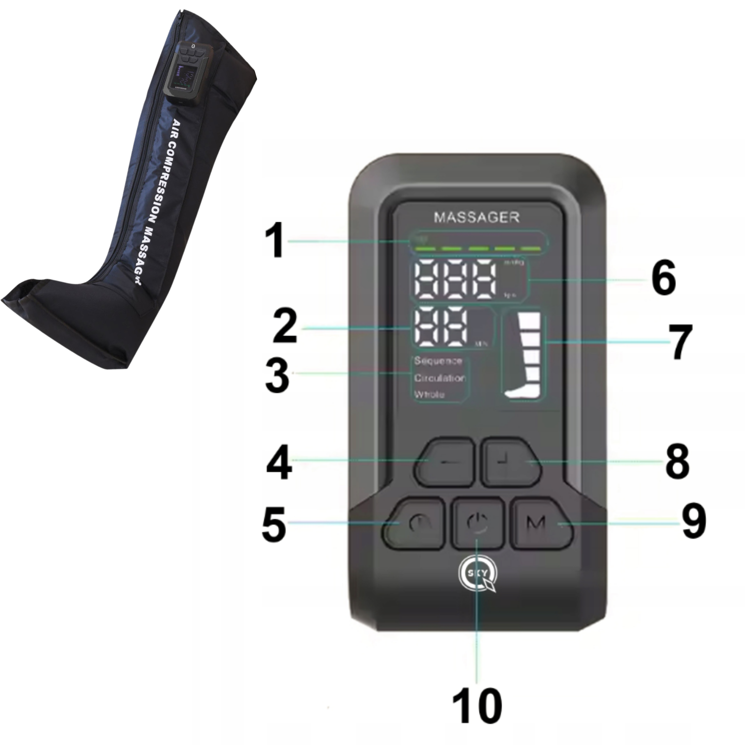 3️⃣ Wyświetlacz trybu – wskazuje wybrany tryb masażu: Sequence, Circulation lub Whole.